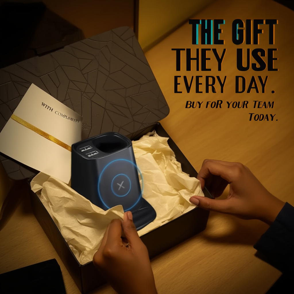 Consider what happens when an employee receives this as part of a welcome kit or Diwali hamper: they set it up on day one. The wireless charger becomes their primary charging method. The LED lamp replaces their desk lamp within a week. The fan runs every afternoon. The pen holder takes the loose pens on their desk. The phone stand means they stop propping their phone against a mug. Your company's brand — on the base, on the packaging — is present in every one of these interactions, every working day, for the entire lifespan of the product.