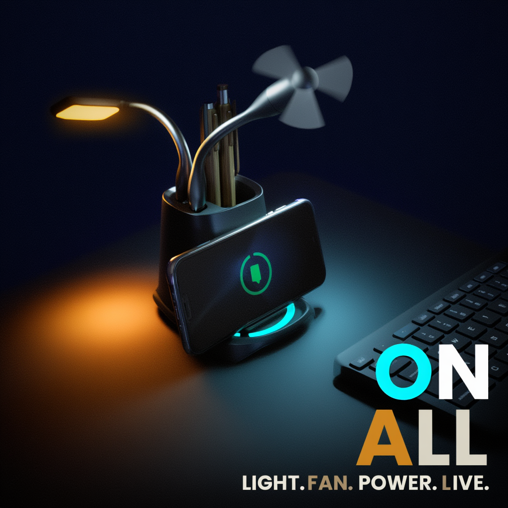 Your desk has a cable problem. A separate charger, a separate lamp, a separate fan, a separate pen pot — and your phone still falls over. This 6-in-1 desk power station replaces all of it with one object. Wireless Qi charging at the base. A USB LED lamp on a flexible gooseneck arm. A USB desk fan on a second gooseneck arm. A pen holder, a phone stand, and a dual USB + Type-C hub — all built in. Buy now or enquire for bulk corporate orders with branding and pan-India delivery.