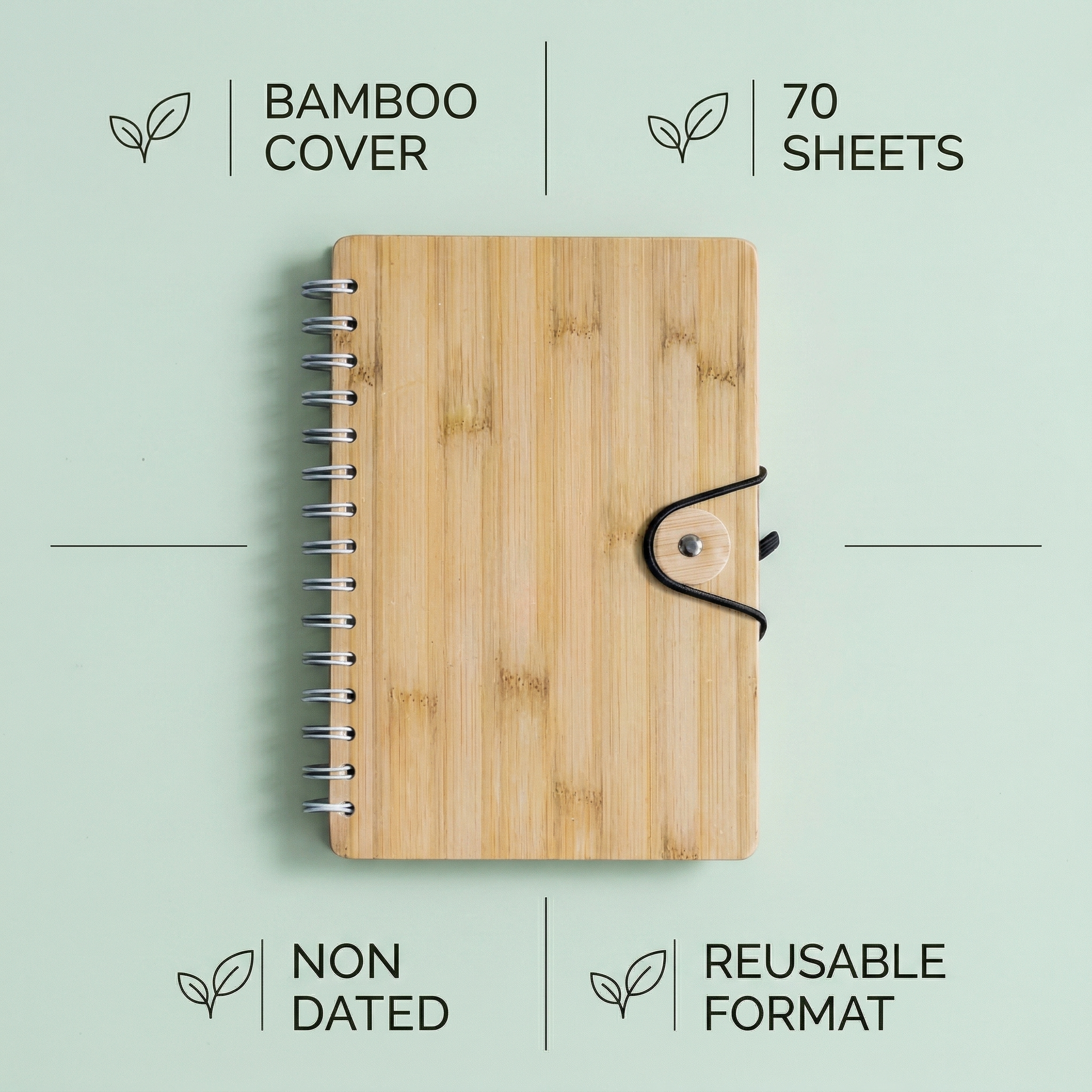 Eco-Friendly Bamboo Notebook A5 with 70 non-dated pages, spiral binding, elastic closure, and natural bamboo cover — designed for sustainable corporate gifting and everyday use.