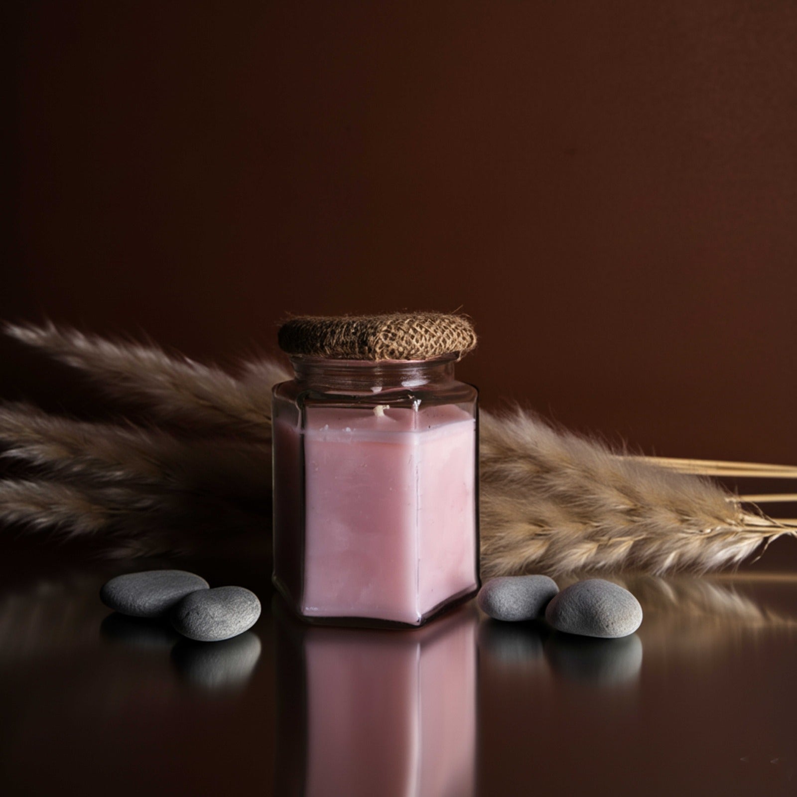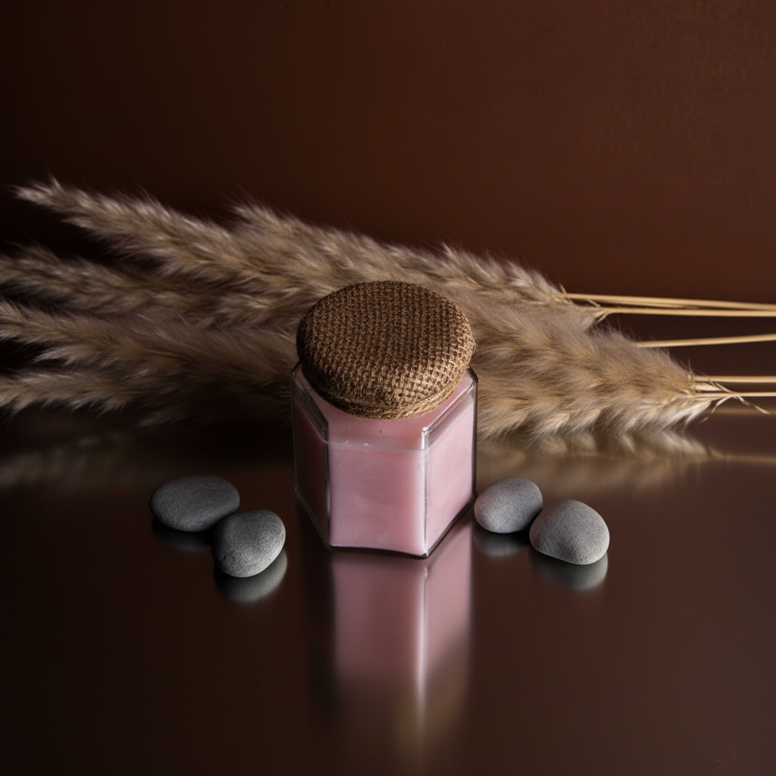 This candle features a hexagonal glass jar paired with a jute-wrapped cap, combining modern aesthetics with natural detailing. Designed to complement any space, it works beautifully as a décor element, meditation candle, table accent, or gifting piece.