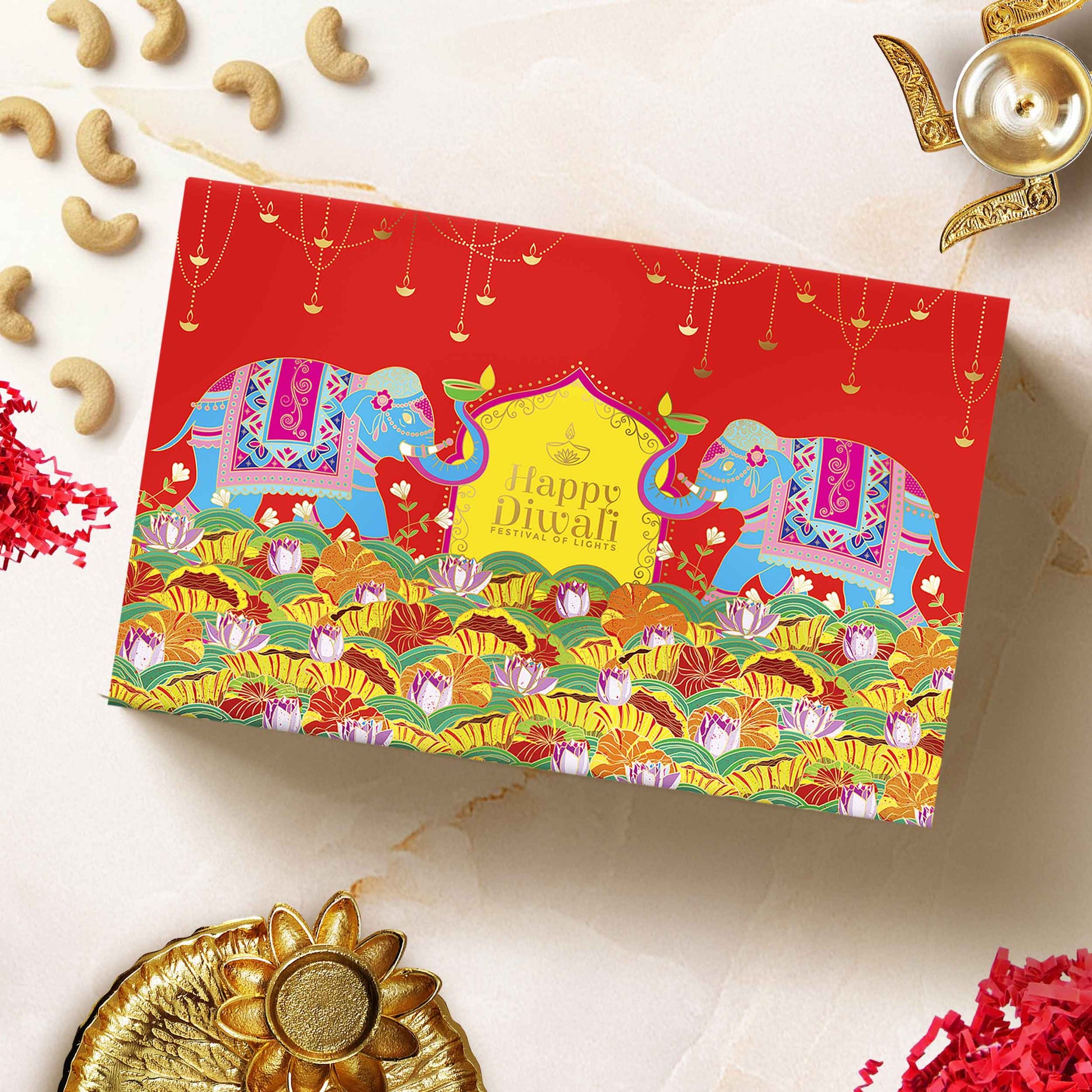 The Eternal Box is named for the timeless traditions and everlasting prosperity it represents. Each element inside has been thoughtfully chosen to symbolize joy, purity, and celebration that never fade. The handcrafted décor platter embodies artistry passed down through generations, while the gold-tinted Swastik diya radiates eternal light and auspiciousness. Adding richness to the experience, a golden mesh jar filled with premium cashews brings the blessing of abundance. Completed with a Shubh Deepavali box and a personalized greeting card, this hamper is more than a gift—it’s a token of goodwill and prosperity designed to be remembered for years to come.