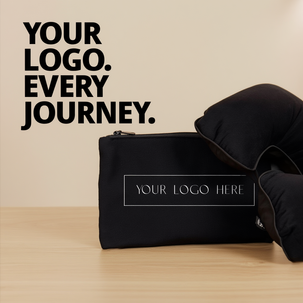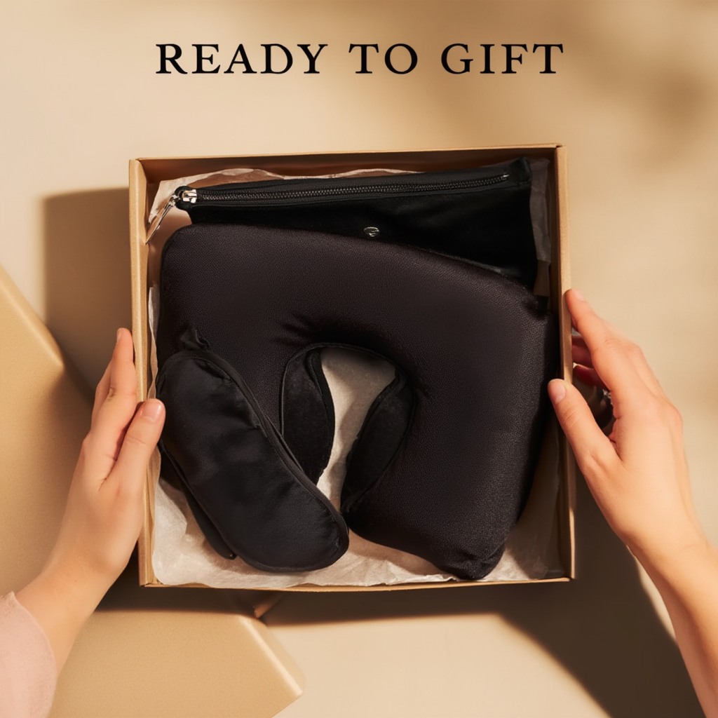 Travel Kit with Neck Pillow, Eye Mask, Ear Plugs and Storage Pouch — a complete travel comfort set designed for corporate gifting, frequent travellers, and bulk distribution.